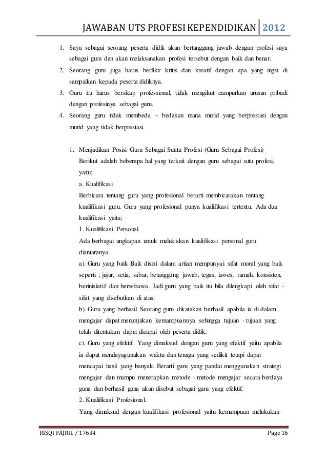 Dalam artikel ini ada 5 soal dan juga jawabannya tentang profesi keguruan. Jun 24, 2018 · soal ujian ut pgsd mkdk4005 profesi keguruan lengkap dengan kunci jawaban serta pembahasan soal kami share untuk anda mahasiswa universitas terbuka. Jun 04, 2014 · soal profesi keguruan i. Profesi pada hakikatnya adalah janji terbuka, bahwa seseorang akan mengabdikan dirinya kepada suatu jabatan. Jul 08, 2014 · uas profesi keguruan.